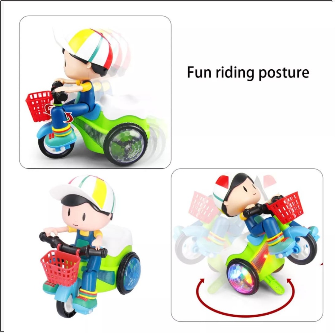 Brinquedo a Pilha Menino no Triciclo Musical que Empina Este lindo carrinho infantil Triciclo Bate, Volta, empina, Gira 360o e toca músicas, é encantador aos olhos das crianças e também dos adultos este carrinho dá um show sozinho, ele é um brinquedo autônomo onde o pequeno garoto montado em seu triciclo anda para todos os lados, empina e gira 360o só com duas rodas tudo isso enquanto toca uma música muito animada Modelos: Boneco Boné Características: – Com Sons – Com Luzes Led’s – Anda – Empina – Gira 360 – Bate e Volta